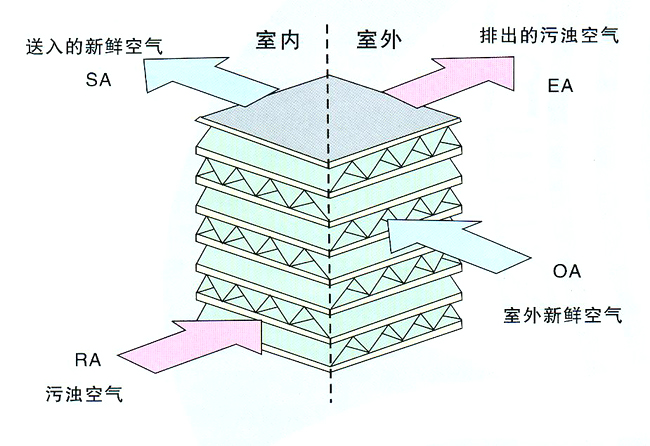 當(dāng)室內(nèi)空調(diào)回風(fēng)和新風(fēng)分別呈正交叉方式流經(jīng)熱交換器時(shí),由于平隔板兩側(cè)氣流存在著溫度差和水蒸汽分壓力差,兩股氣流間同時(shí)產(chǎn)生傳熱傳質(zhì),引起全熱交換過程。這種過程是經(jīng)過平隔板完成的,所以,屬透過型全熱交換。當(dāng)安裝在系統(tǒng)上的全熱交換器在夏季運(yùn)行時(shí),新風(fēng)從空調(diào)回風(fēng)中獲得冷量,使溫度降低,同時(shí)被回風(fēng)干燥,使新風(fēng)濕度降低;在冬季運(yùn)行時(shí),新風(fēng)從空調(diào)回風(fēng)中獲得熱能,使溫度升高,同時(shí)被回風(fēng)加濕。就是通過這樣的全熱交換過程,讓新風(fēng)從空調(diào)回風(fēng)中回收了能量。
