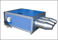該機組選用鋁合金材料制成的多翼式風葉、用薄鋼板經(jīng)噴塑(烤漆)處理并包裹消音材料作為風機外殼,由安裝吊環(huán)、接線盒、進風口過濾網(wǎng)、可拆卸式檢查板、不銹鋼金屬軟管和阻燃塑料制成的噴嘴組成。備有三種機型,采用同種風機,僅因噴嘴配置不同而異,分別有:單噴嘴機組、雙噴嘴機組,其噴嘴口徑分別為140mm、100mm和80mm 。